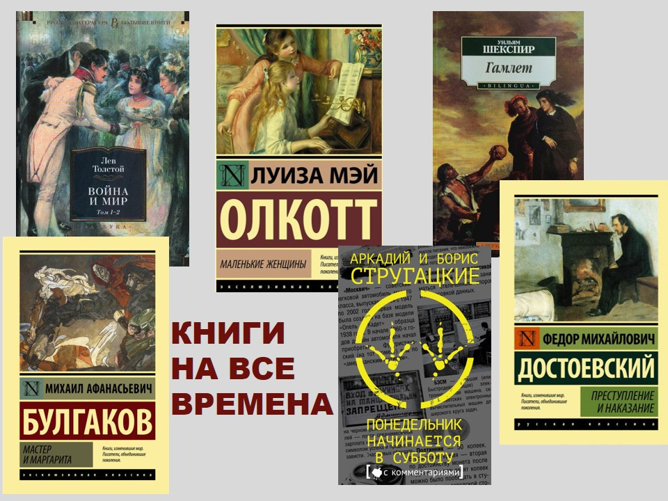 «Книги на все времена» — это книги, которые со временем не утрачивают своих моральных ценностей, книги, которые открываются по-новому при каждом их прочтении в виду приобретения нового жизненного опыта. Бесспорно, к таким книгам относятся значимые литературные произведения из разных стран, культур и времен, прежде всего, произведения классической литературы: «Мастер и Маргарита» Михаила Булгакова, «Преступление и наказание» Федора Достоевского, «Война и мир» Льва Толстого, «Гамлет» Уильяма Шекспира и многие другие.
