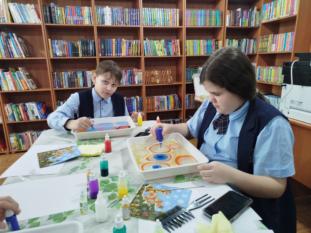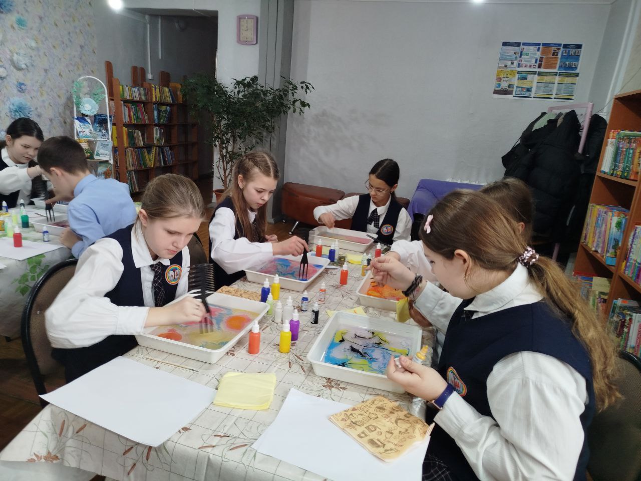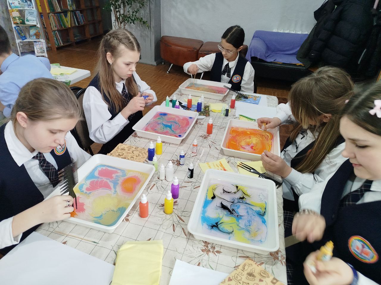 Дети освоили азы техники рисования на воде — эбру, создав собственные картины. А помогали им в этом волонтеры нашей библиотеки.