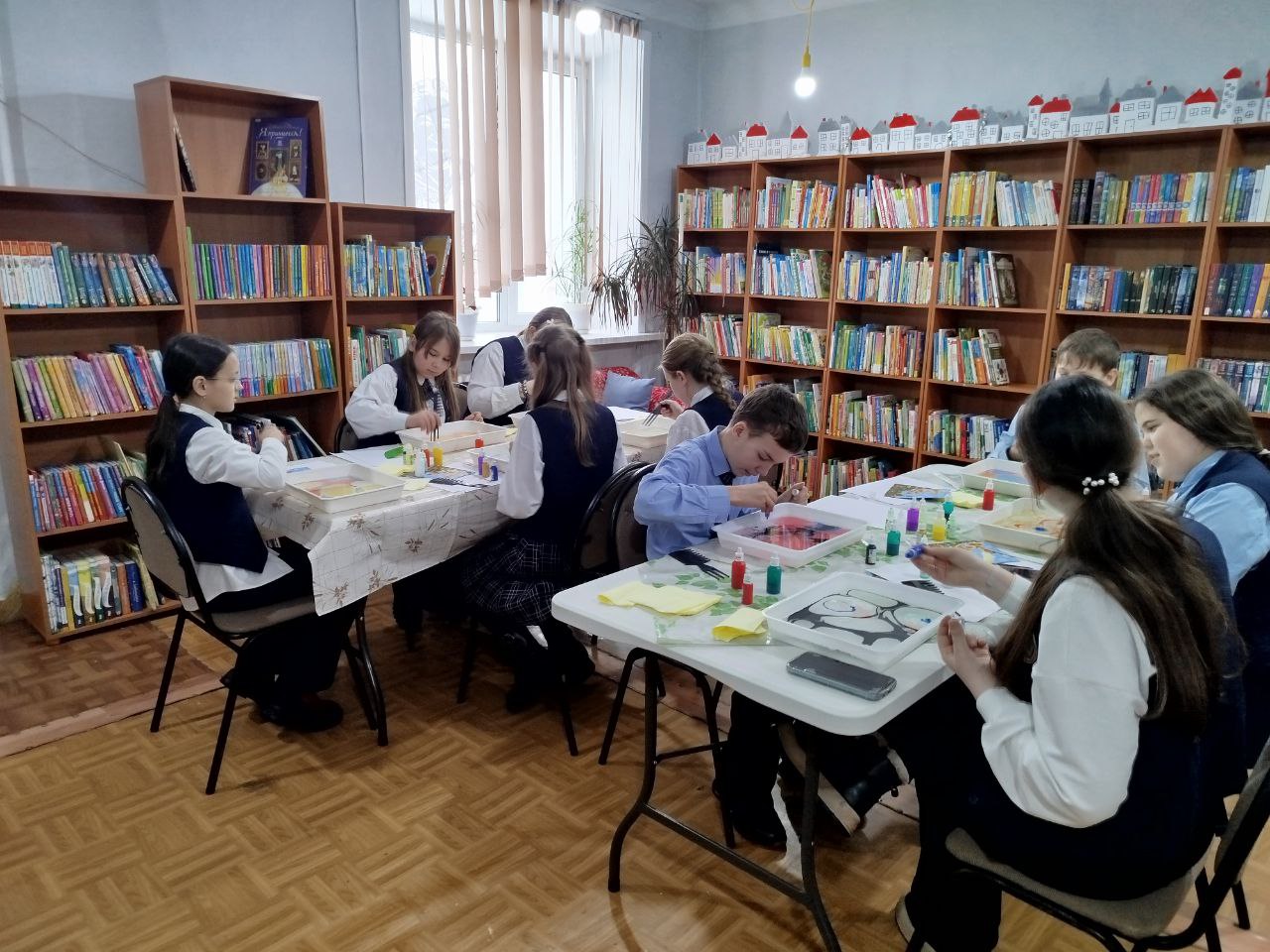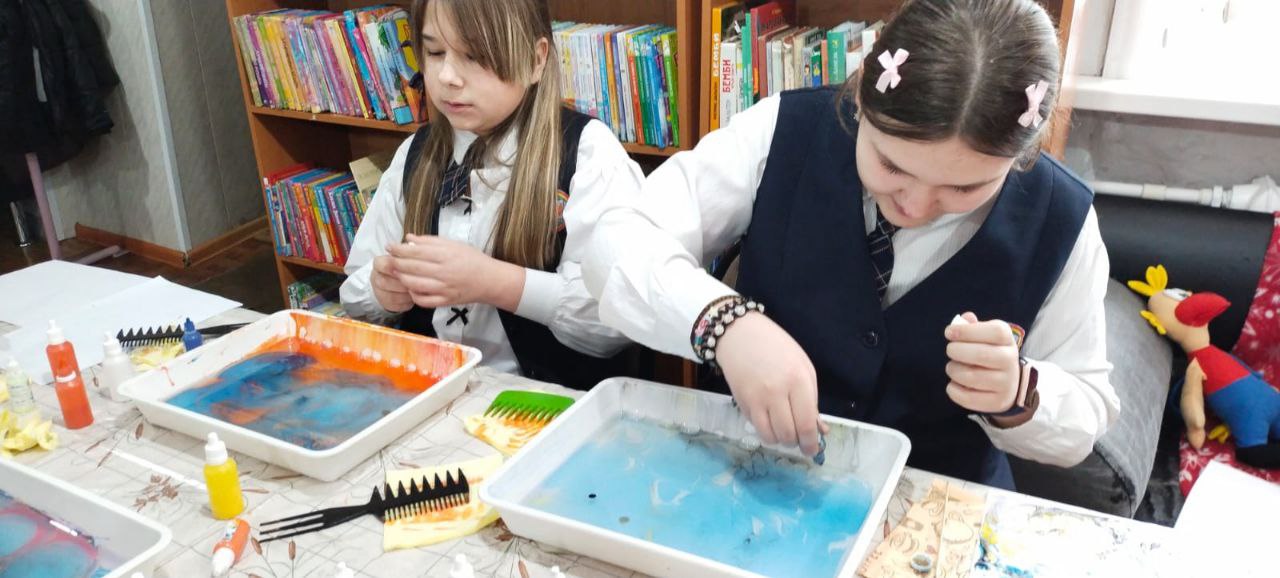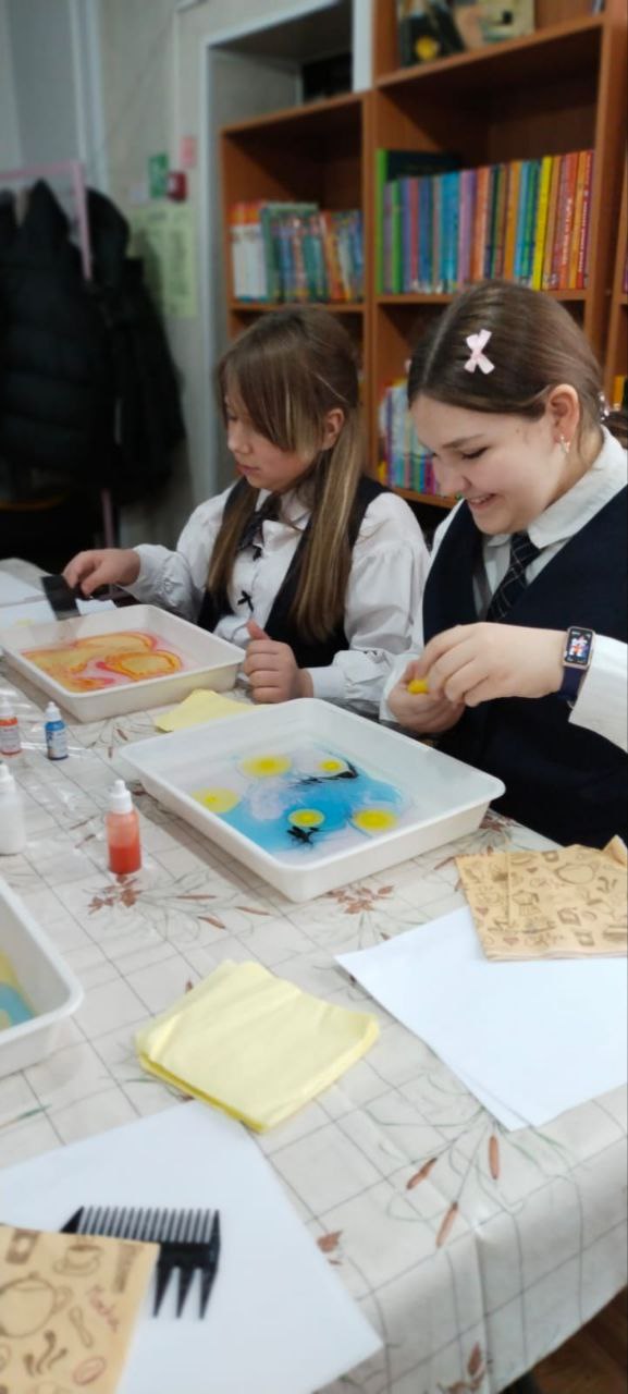 Дети освоили азы техники рисования на воде — эбру, создав собственные картины. А помогали им в этом волонтеры нашей библиотеки.