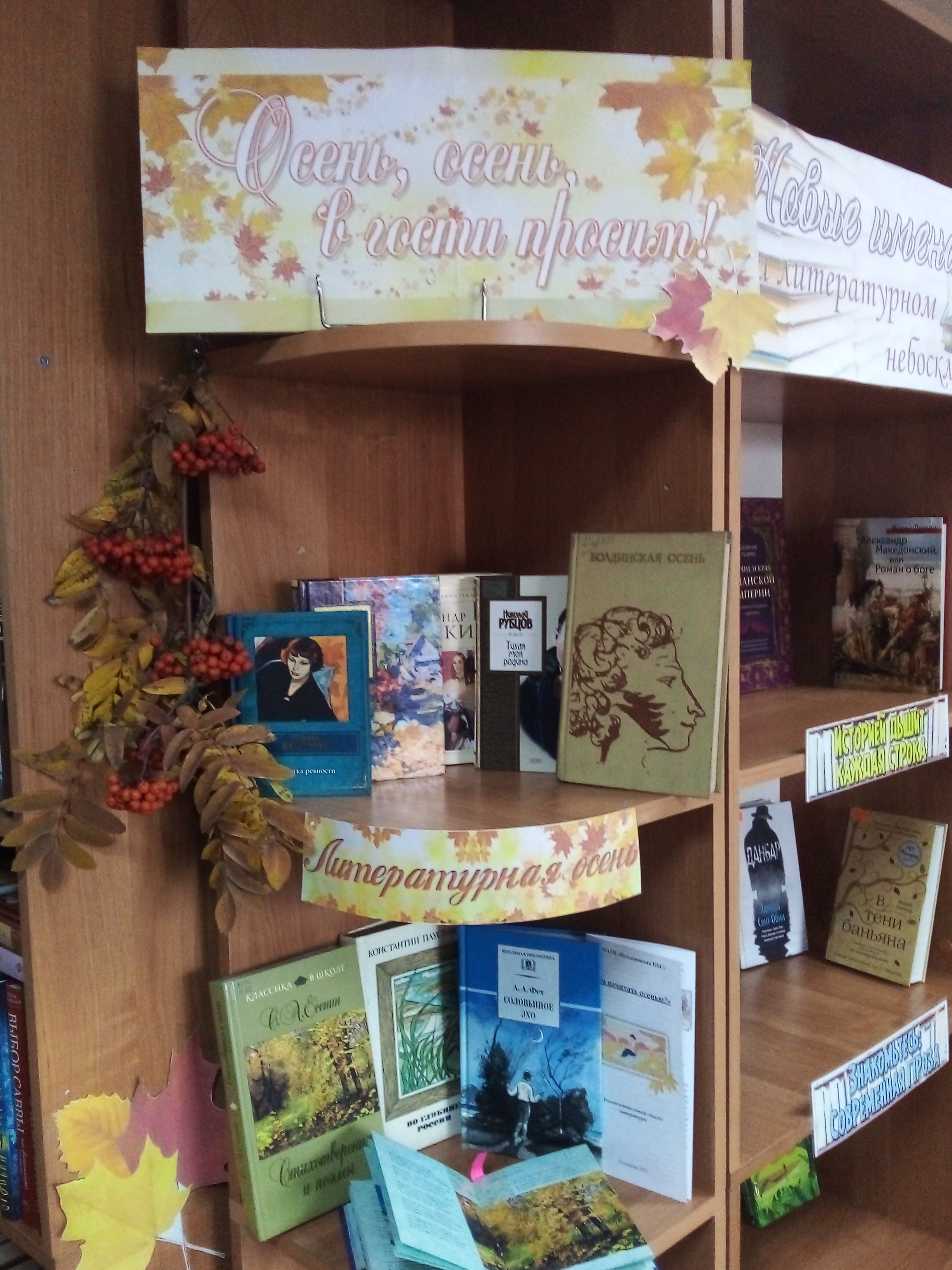 9 октября на абонементе ЦГБ оформлена книжная выставка "Осень, осень, в гости просим!", посвящённая этому замечательному времени года. Осенью восхищались многие поэты, и каждый по-своему показывал её в своих произведениях. В разделе "Литературная осень" представлены: сборник "Времена года в поэзии серебряного века", Пушкин А. С. «Болдинская осень», Бунин И. «Антоновские яблоки», стихотворения Н. Рубцова, А. Фета, С. Есенина, М. Цветаевой и др.